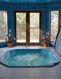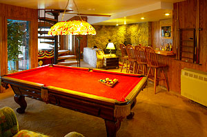 boasts a pool table, wood-burning fireplace sitting area, wet bar, and